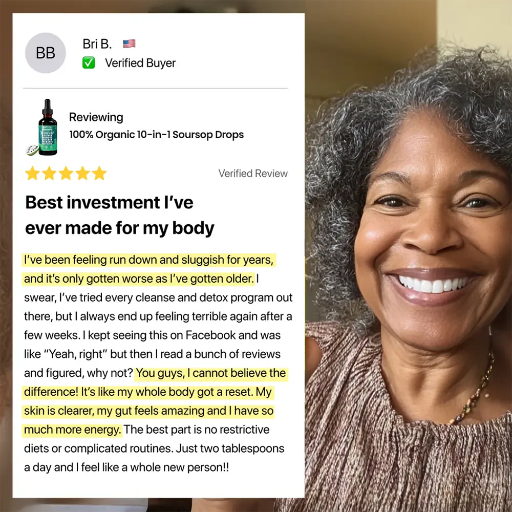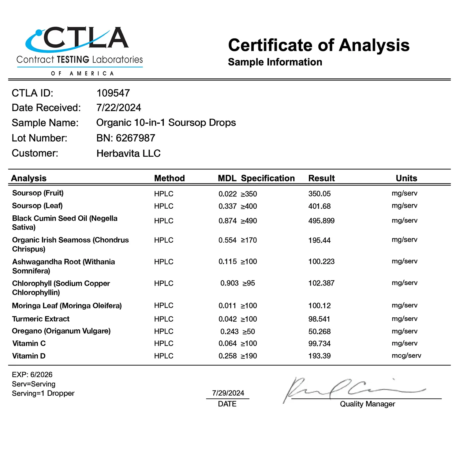 Elevate your wellness with 100% Organic 10-in-1 Soursop Extract Drops, a powerful blend of soursop, moringa, turmeric, and ginseng. Packed with antioxidants, this 2 fl oz (60 mL) formula supports your immune system, heart health, and digestive wellness while reducing stress and boosting energy levels.